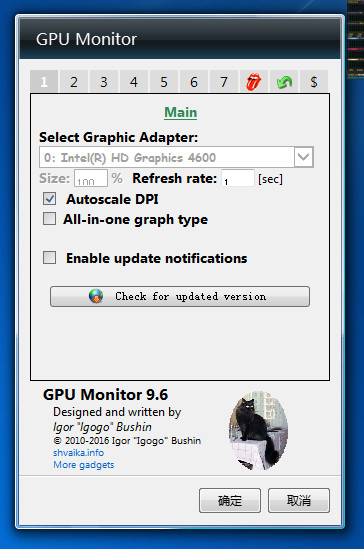 gpu monitor是一个显卡监视桌面小工具,适用于windows 7和windows vista操作系统。支持nvidia或amd/ati显卡。体积非常的小巧,能够实时反映显卡的情况,有需要的朋友赶快下载吧!小工具默认英文,可以设置为简体中文。