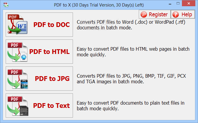 TriSun PDF to X是一款能快速将PDF文件批量转换为其他格式文件的pdf批量转换工具,能够支持将PDF文件转换为word文件格式、PDF文件转换为jpg图片格式、PDF文件转换为txt以及HTML文件格式。使用者可以通过点击软件界面中需要的转换方式来批量转换PDF文件,只需要在接下来出现的窗口添加需要转换的文件并点击几下必要的选项即可一键转换所有添加的PDF文档,目前支持pdf转doc,pdf转jpg,pdf转txt,pdf转html,欢迎免费下载体验。【功能介绍】