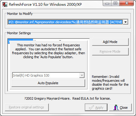 和生命健康开玩笑可不好,面对着60Hz的显示器看一天和对着日光灯看一天并没有什么区别。所以,桌面刷新率和游戏刷新率的重要性就不言而喻。而以下提供的则是网络上多种锁定方法中个人认为比较好的几种。刷新率分为垂直刷新率和水平刷新率,垂直刷新率表示屏幕的图象每秒钟重绘多少次,也就是每秒钟屏幕刷新的次数,以Hz(赫兹)为单位。我们一般提到的刷新率通常指垂直刷新率。一般来说,如果刷新率在85Hz以上,人的肉眼就不会感觉到闪烁,这对保证用眼健康很有好处。【使用方法】