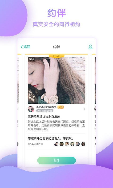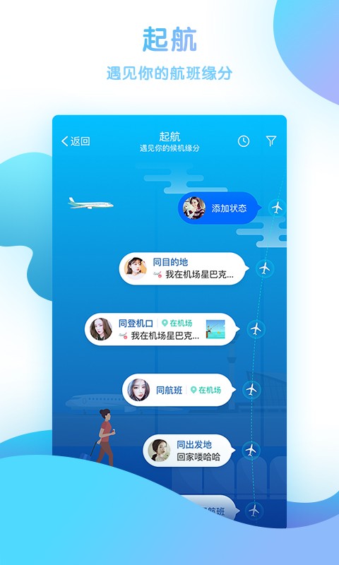 1、新增起航模块:选择你的目的地城市,航班号和起飞日期,即能为你筛选出有缘途友。2、新增约伴模块:说出你的约伴想法,快速相约真实的TA,共享旅途时光。