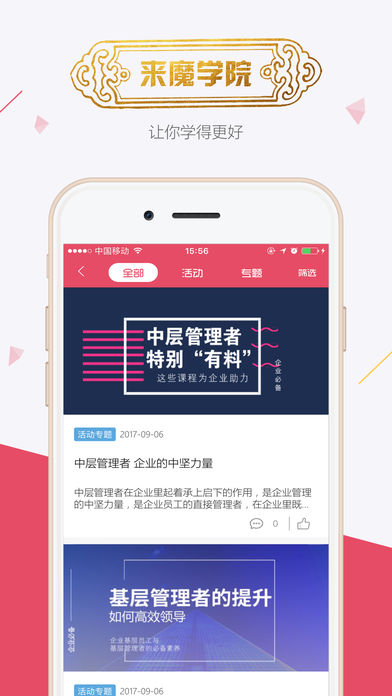 魔学院是面向企业的移动学习和培训管理云平台,全面支持App、微信、企业微信、钉钉、PC、TV,并可以无缝集成到企业的IT系统或第三方平台。【软件特点】