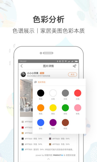 独创性色彩分析,家图中的每一张图片都有专业的色彩图谱分析,告诉您真实的图片色谱分布,并以此为您推荐相似色谱的精美图片,激发您的装修灵感。