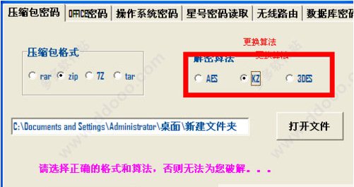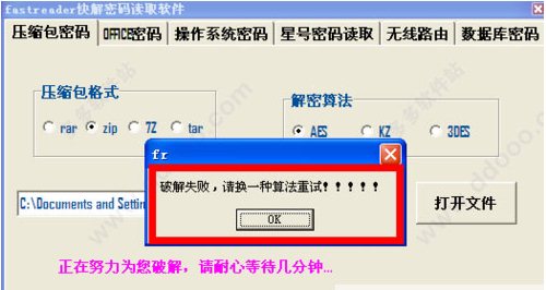 如果提示提示“破解失败,请换一种方法重试!”的话,则需要在第二步中更换解密算法