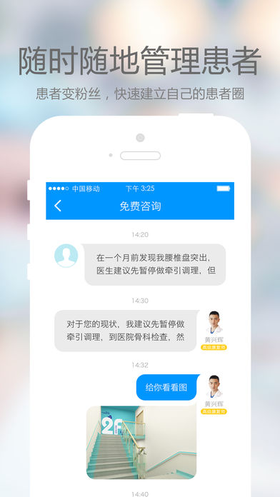 1.如果你是医生病患可通过图文、语音、视频方式在线问诊并发送之前病例档案记录便于病情诊断。病患预约订单实时更新,就诊记录病例便捷管理。用户通过二维码扫描关注医生,建立个人知名度。