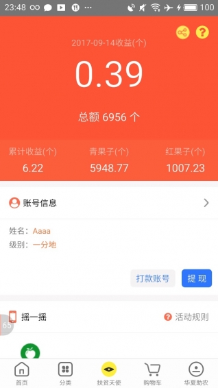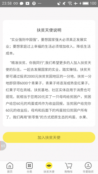 “实业强则中国强”,要想国家强大必须真正发展实业;要想家庭过上幸福的生活必须增加收入,降低生活成本。 “扶贫你我、你我同行”,我们希望更多的人加入扶贫天使的队伍,一起去发展国家的实业,踏实賺钱。扶贫天使可通过投资2000元扶贫贫困地区的一分地,扶贫一分地即获得6000个青果子,青果子将逐渐成熟变红果子。红果子可在商城、扶贫基地、社区实体店用于消费也可提现。就相当于您用20元买了一只母鸡给贫困户,贫困户给您60元的鸡蛋或鸡作为收益回报,当贫困户给完你60元的收益后,母鸡和后面下的鸡蛋就归贫困户所有了。我们再用“新零售”的方式把原生态的鸡蛋、水果、大米、油等生活刚需品直接送到扶贫天使(消费者)家里。 旨在通过“新零售+扶贫=再创富”的方式发展农业的供应链系统,从“种苗、农资、生产基地、社区实体门店”发展实体经济并在各个环节产生利润,让参与扶贫的人都有分红收益。【更新日志】