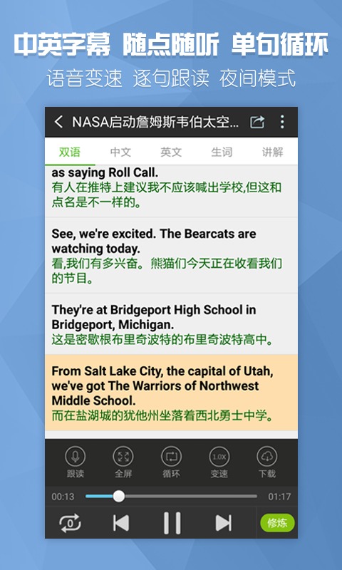 1、离线收听:支持mp3和中英字幕批量下载,不耗流量不花钱。2、听力训练:语音同步双语字幕,单句循环,反复精听,轻松掌握所有知识点。