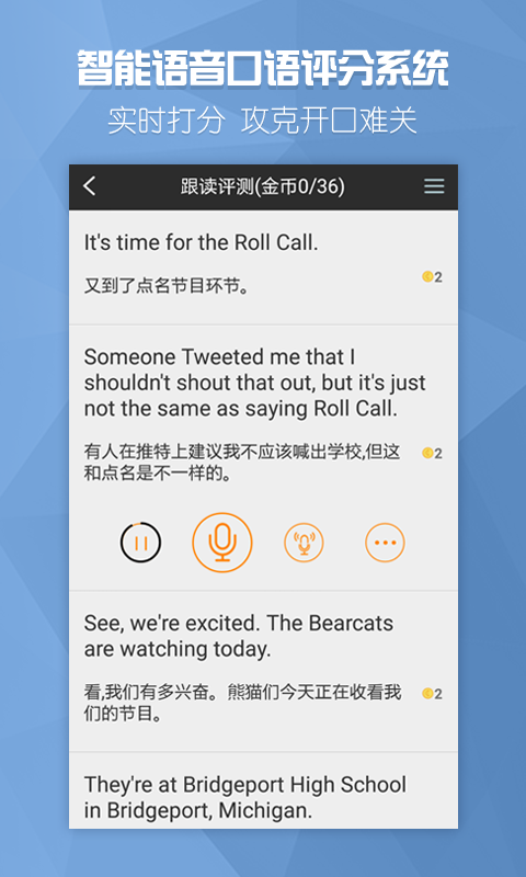 3、口语训练:逐句跟读,智能口语评分系统逐字逐句实时打分,帮您攻克“开口”难关。