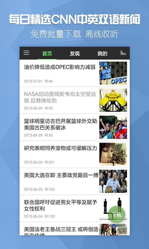 1、免费批量下载、离线收听每日精选的CNN中英双语新闻2、智能语音口语评分系统:实时打分,攻克开口难关