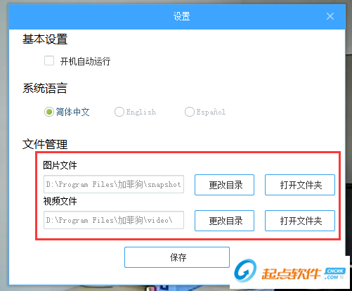 b) 设置文件(图片及视频)存储的目录,默认存放在软件安装目录
