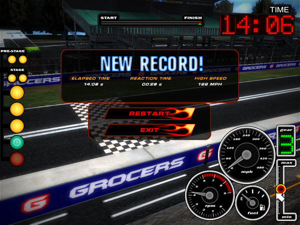 游戏的目的是追求速度,但是操作过程中需要我们有极好的操作技巧。一定要在加速条的MIN和MAX之间保持平衡,当看到赛车头翘起来太多的时候我们要适当把加速条压下去一点,另外要注意的一点就是在转速5000转左右的时候要及时换档,这样才能赢得比赛。