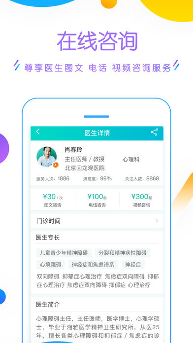 “好心情”移动医疗服务平台是国内唯一专注于精神和心理领域的专业移动医疗平台,致力于成为精神心理领域互联网医疗企业的领导者,平台秉承 “有你,就有好心情”的核心价值理念,成为2万名精神心理医疗专家的执业平台,同时服务中国1.6亿精神和心理健康需求的用户,整合优质医疗资源通过互联网技术连接服务,助推中国人的“精神健康”。【软件特点】