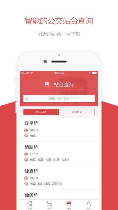 线路站台查询除了对线路站台进行搜索外,还能根据手机定位快速查找您附近的线路和站台,同时您可将常用线路加入收藏,以便更快查询。