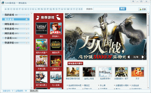 想玩就玩游戏盒 V2.1 简体中文官方安装版 LavaGame(游戏盒子)是北京点击科技有限公司2010年重磅推出的一款“即选即玩”游戏拼台,内置单机游戏、网络游戏、小游戏近万款,用户选择好自己喜欢的游戏后,通常只需求加载几秒到十几分钟即可开始游戏。基于点击科技独有的LavaNet虚拟网络操作平台,彻底颠覆了普通客户端游戏“下载、安装、启动”的模式,实现了类似网页游戏(WebGame)的“即点即玩”效果,绿色快捷,自动更新,大大降低了玩家对大型客户端游戏下载和使用的门槛。