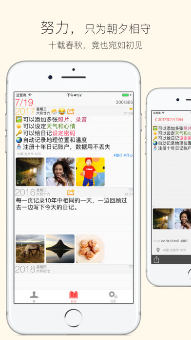 数十万人使用,让人爱不释手的“十年日记”。写下今天日记的同时,可以回顾过去每年的今天发生了什么,每天只写4行,毫无压力,让写日记成为每天最放松的时光。