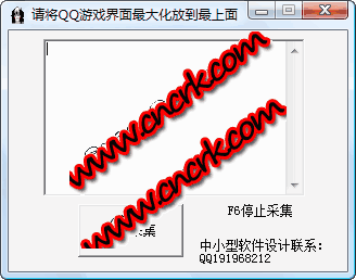 QQ游戏号码采集器 V2.0 绿色免费版 QQ游戏号码采集器可以全自动采集QQ游戏中房间主人的QQ号。QQ游戏启动后,进入房间,将游戏窗口最大化,然后将程序放置于游戏窗口上部(见界面图片),此时点击开始采集,即可自动采集该房间QQ号码。需要停止请按F6键