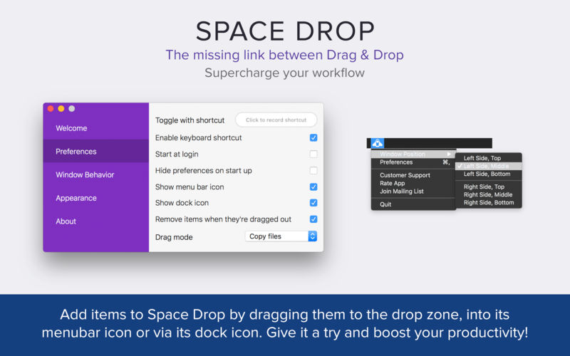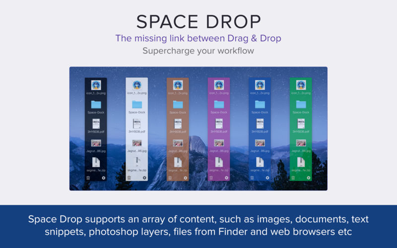 Space Drop Mac版是Mac平台上的一款系统优化和文件管理软件,Space Drop Mac版可以让拖放文件更容易,随时随地显示,随时开始拖动文件。创建一个临时的区域,你可以在需要删除的文件位置存储文件。【软件特点】