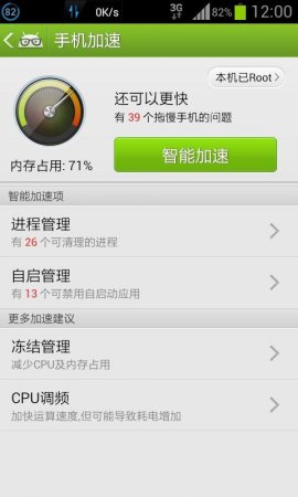 1、下载安装好后,如果你的手机root了,请给予root权限使用安卓优化大师,root权限会让安卓优化大师的功能更加强大。2、手机加速力可以冻结程序,使其不能使用,这个可以用来隐藏手机里的一些应用不让别人使用,想自己使用再取消冻结