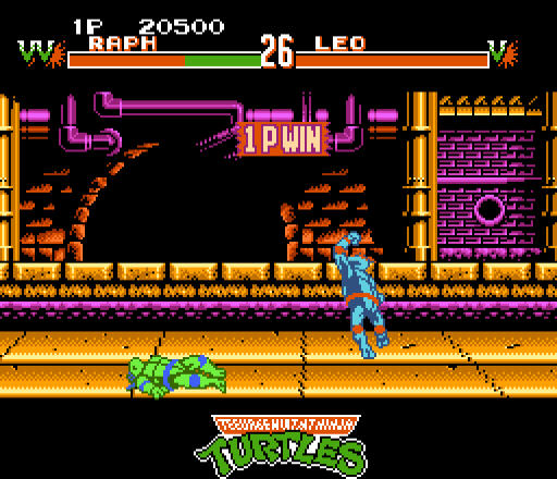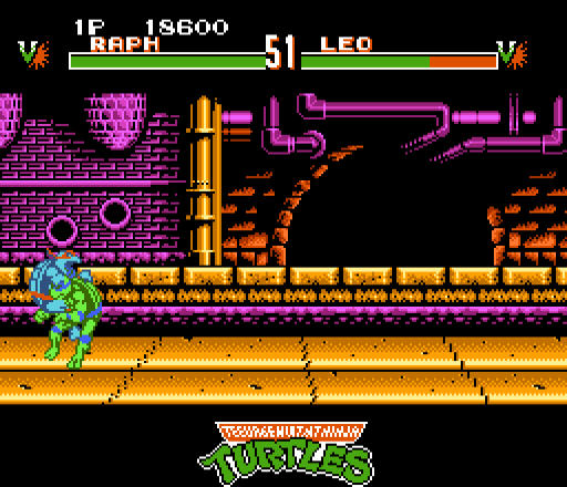 忍者神龟格斗电脑版是神龟在FC上的最后一作,竟然还是格斗类型的游戏,流畅感稍有欠缺,不过仍旧有板有眼,素质颇高,动作硬派,在FC上估计没有哪款格斗游戏能够出其右,音效不错,同时加入不少语音,音乐依然保持以往的水准,特别是与西莱德决战的那首曲子,非常像以前流行的的士高,可能因为FC容量的限制,角色和场景稍微少些。【游戏特色】