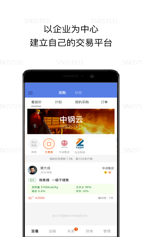 以企业采购、销售、物流需求为中心,助力每家企业轻松实现互联网+,拥有企业自己的“交易+物流+大数据+管理平台”。打造一个全新的产业互联网平台,一种全新的工作方式。该 APP 为企业交易专用端。