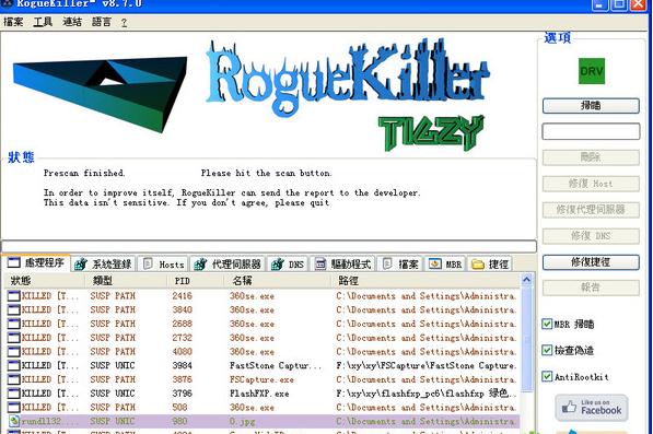 本程序不依赖病毒特徵码,用于侦测最新的威胁,这是很好的,但也会提高误报率。当我们启动了 RogueKiller 时,举例来说,它立即终止两个完全无辜的处理程序,因为它认为它们从「可疑路径」执行。本程序的报告包含大量有用的资讯,可能是可疑的启动程序、HOSTS 文件行、代理服务器和 DNS 设定、驱动程序、捷径、MBR 代码等等...