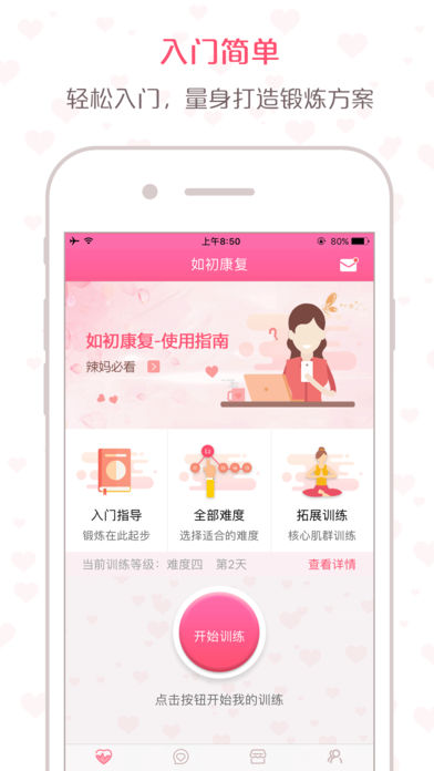 如初是以盆底肌锻炼工具为核心,辅以产后辣妈社区、产后恢复指导视频、锻炼商城等服务,为产后妈妈们打造一个专业、私密的康复平台。【软件特点】