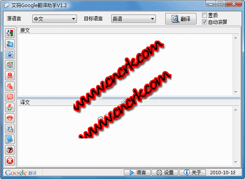 艾码谷歌翻译助手 V1.5 简体中文绿色免费版 软件通过调用Google翻译开放api进行翻译,软件支持多种语言相互翻译,支持google语言检测,多次翻多文本自动分译;支持文本编辑及拖放; 支持中英文两种语言;提供常用网站快速导航,支持托盘操作;纯绿色软件,无需安装,下载可直接运行,占用资源小,启动快