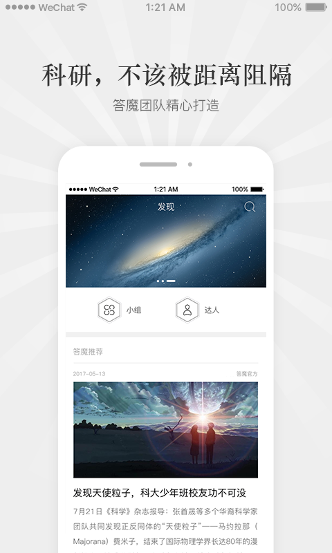 答魔是一个服务于科研领域高知人群的社区,在提供了问答服务的同时,为了让大家能够进一步交流、实现交叉研究,产生新发现,我们还提供了小组功能,让大家畅所欲言论科研。