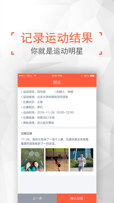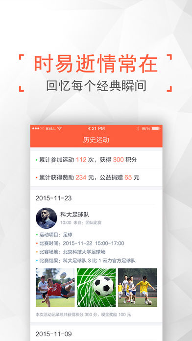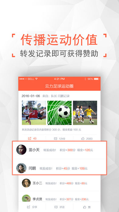 记录战报形成历史战绩——在云力,你就是运动明星无论是个人,还是团队,无论是足球篮球,还是乒乓球羽毛球,每一次的运动用户都可以记录下运动时间、地点、对手、胜负关系、关键数据、比赛花絮和精彩图片。管理自己的运动团队、粉丝观众。留下自己的记忆,分享给队友、朋友。