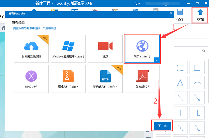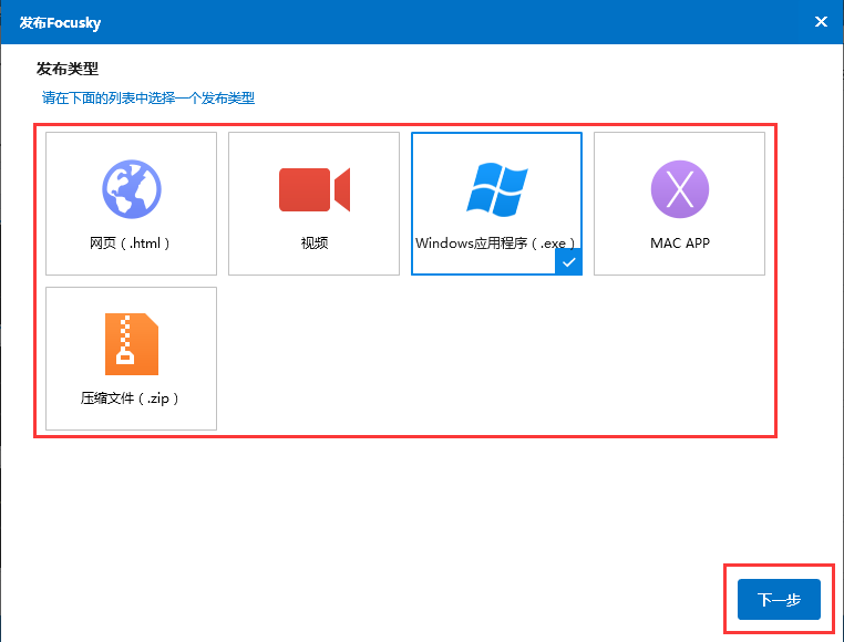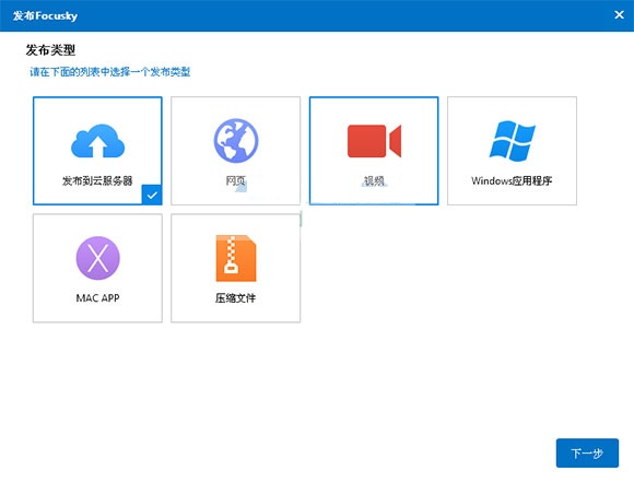 3、在弹出的“发布”窗口上共有5种发布类型(网页、视频、Windows应用程序、MAC APP和压缩文件),选择其中任意一种后,点击“下一步”。