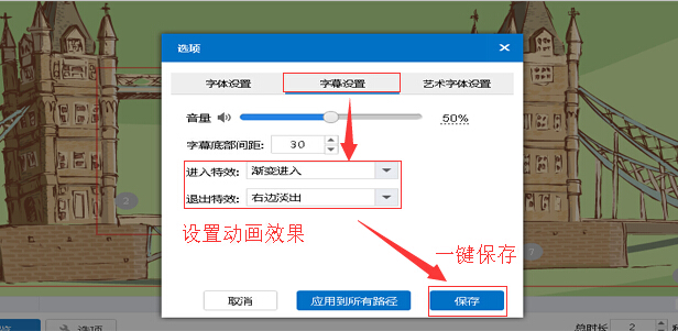 在“字幕设置”标签页里找到“进入特效”和“退出特效”,设置动画效果,最后点击保存即可。
