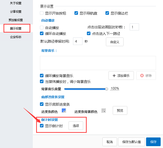 2 依次单击“展示设置”—>“倒计时设置”—>勾选“显示倒计时”->点击“选项”进入倒计时设置的对话框。