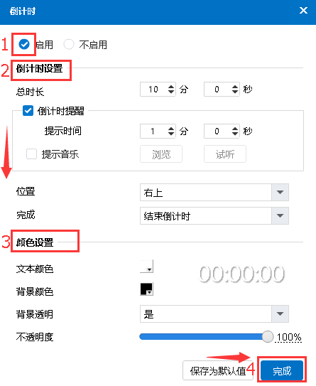3 勾选“启用”倒计时—>设置倒计时时间、时间显示颜色—>设置好后单击“完成”按钮保存当前设置即可。