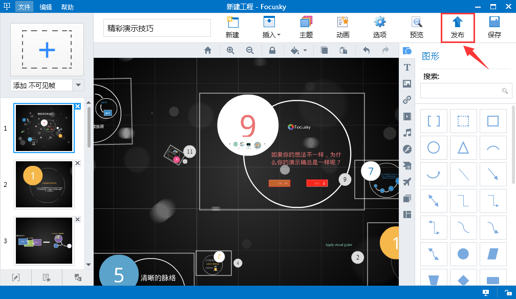 1、在Focusky动画演示大师上打开预发布的工程项目文件;