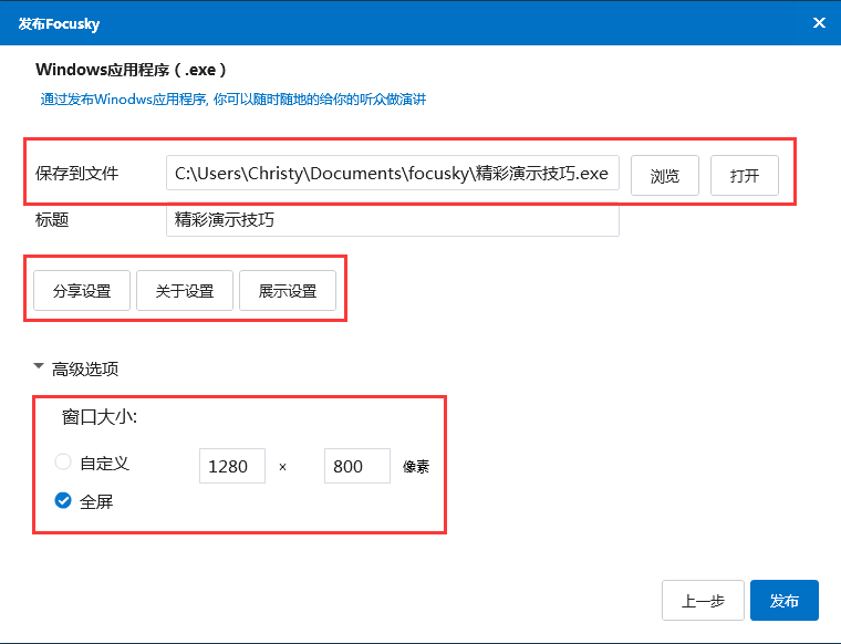 4、选择保存动画演示稿的目录或新建一个目录。在这里,你还可以修改动画演示稿的关于设置、分享设置、预加载设置、展示设置以及企业标志,也可以自定义动画演示稿的窗口大小。