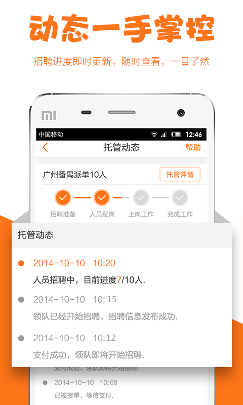【招聘更高效】兼职猫拥有600万大学生兼职人才库,推出“发布托管招聘”,一键托管,专业领队帮您快速招聘,体验省心省力的招人快感。【管理更规范】兼职猫可以对应聘者实现查看简历,即时沟通,一键录用,批量签到,薪酬结算等方面的管理。