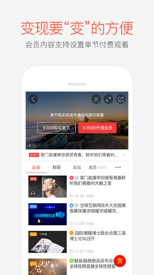 直播-音频、视频、录屏,多种直播形式,手机、电脑、摄像机多终端发起;社群-每个人都可以拥有自己的粉丝,每个社群都是一家网校;