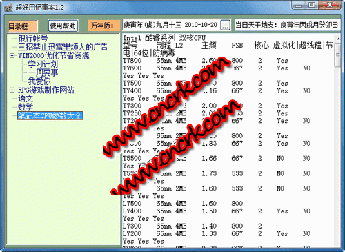 本软件以树型框建立目录,以微软的access数据库为储存内容之数据库,还加有日历查询,操作简单,功能强大,还可免费使用。