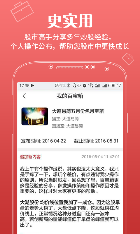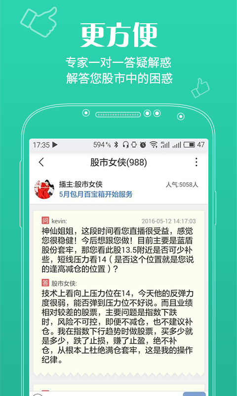 在这里,你可以和股市导师交流,时时互动。与炒股高手成为朋友,一对一地答疑解惑。加入我们,你不再是股市门外汉。在这里,你还可以得到实时牛股,掌握机会。加入我们,你不再是一个人战斗。