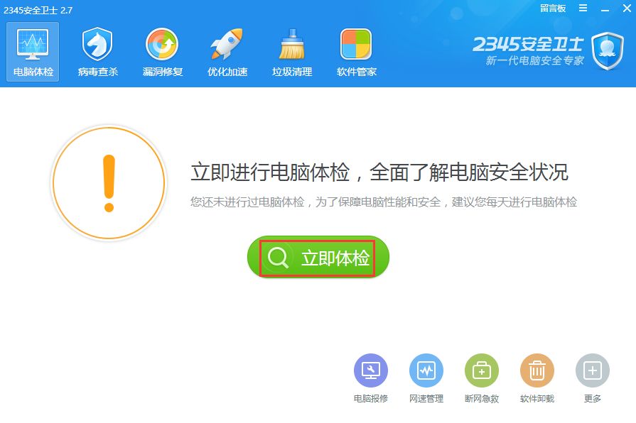 1、下载并安装最新版本的2345安全卫士2、安装完成之后打开软件,在首页单机“立即体检”来对电脑进行体检,可根据体检结果对电脑进行一定优化,如防止恶意软件、病毒对主页及浏览器的篡改。