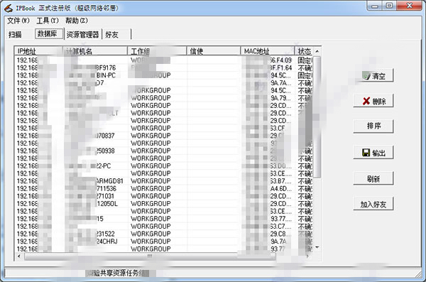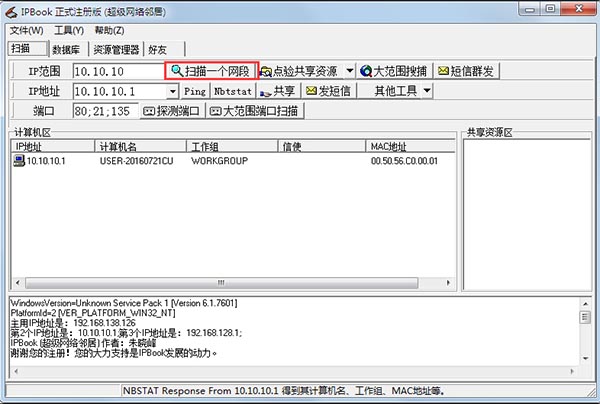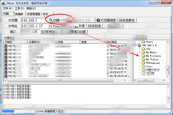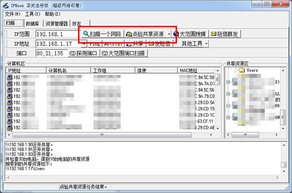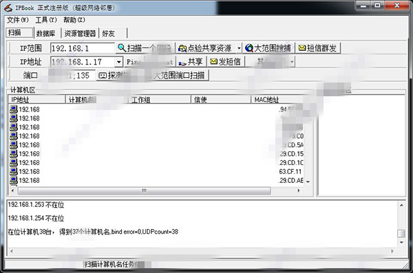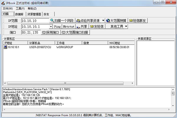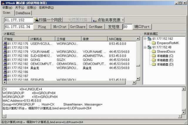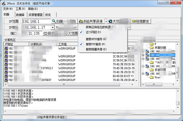 然后,点击“扫描一个网段”和“点验共享资源”这两个按钮,可以查出计算机名与共享资源。如果注册后,“大范围搜索”的功能就被激活了,可以同时搜索任意范围的计算机名,工作组,MAC地址及共享资源等等。