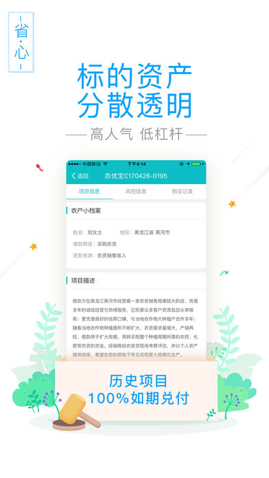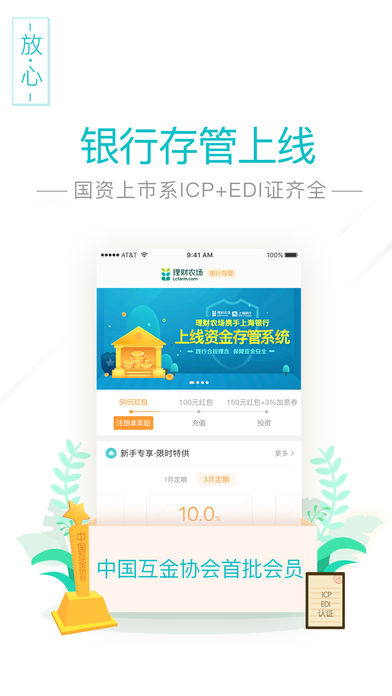 “理财农场”是国内农化龙头上市公司诺普信(股票代码:002215)和国资集团“深创投”领投的“结合农业生产场景”的农业互联网金融理财平台,央行牵头的国家互联网金融协会首批会员,荣获2016年中国资产管理金贝奖。【软件优势】