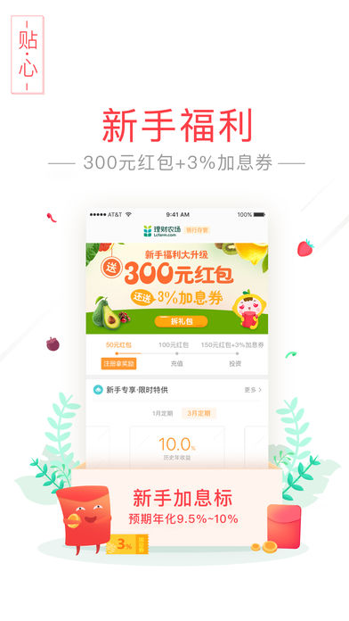 300元现金红包,3%加息券新手加息标,年化收益9.5%~10%