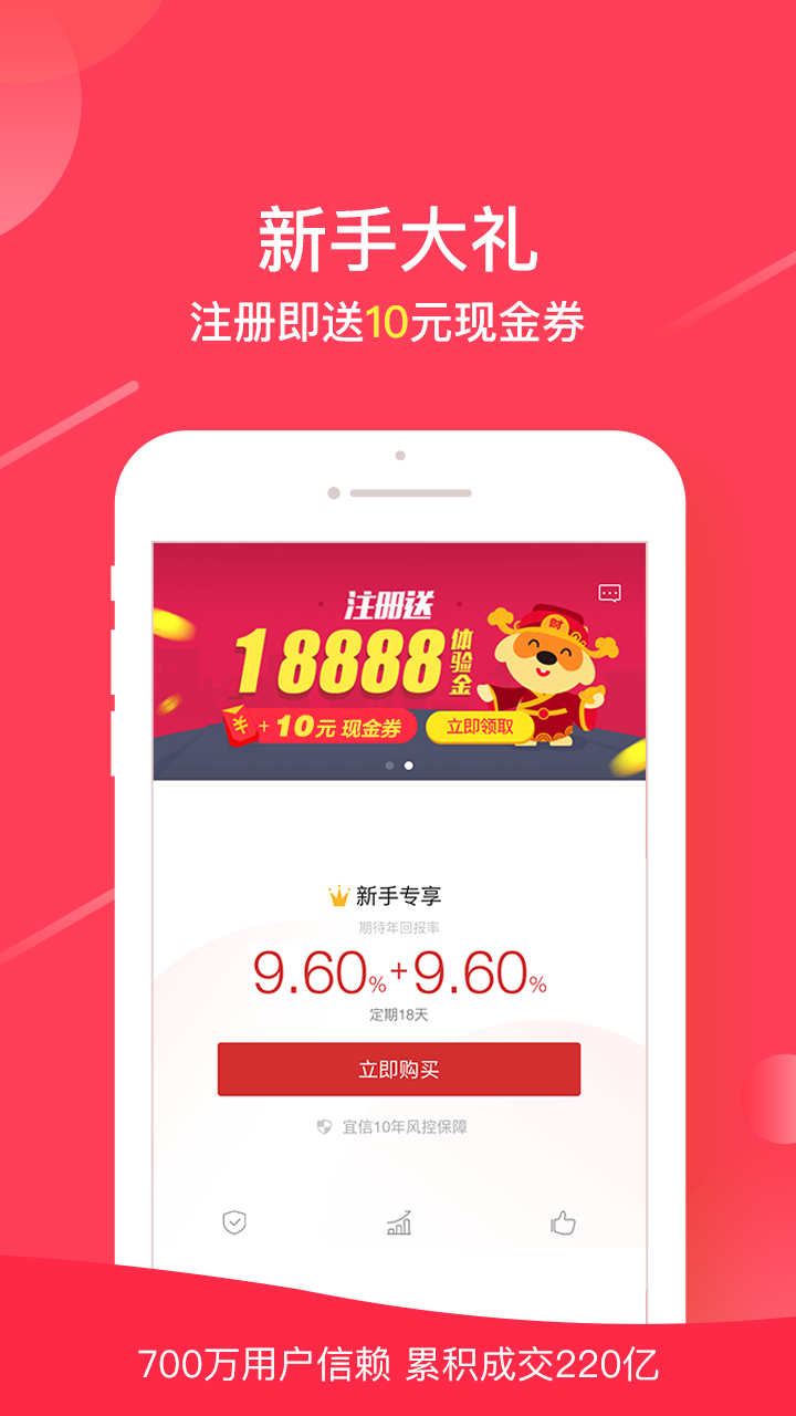 新用户注册免费领取10元现金券,投资即可提现!(红包投资可抵现金,真实有用!体验金收益可提现,可兑换流量、话费、京东卡及实物奖品!)