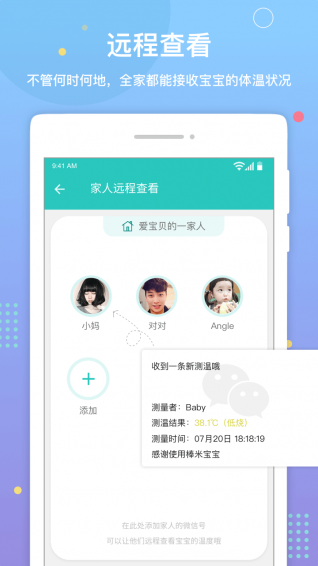 上班时家里有老人带孩子,一旦宝宝生病就不停打电话问病情。而通过棒米宝宝,耳温计的测温将自动通过微信发送到您的手机,让您放下牵挂。