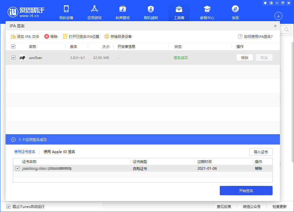 5、选中用于签名的IPA文件以及证书,接着点击“开始签名”就可以了。