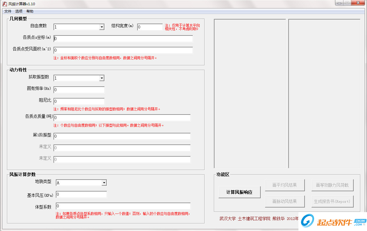 双击“风振计算器v110.exe”,运行;有3个例子,可通过菜单【文件】—>【导入数据】将1个数据文件导入;