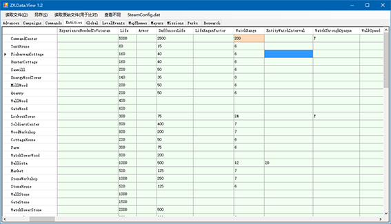 目前游戏(v.4.6.6), 选项卡只有Commands(升级和单位攻击), Entities(建筑和单位), MapThemes(影响地图生成), Mayors(市长效果)这四个页中的数据有效