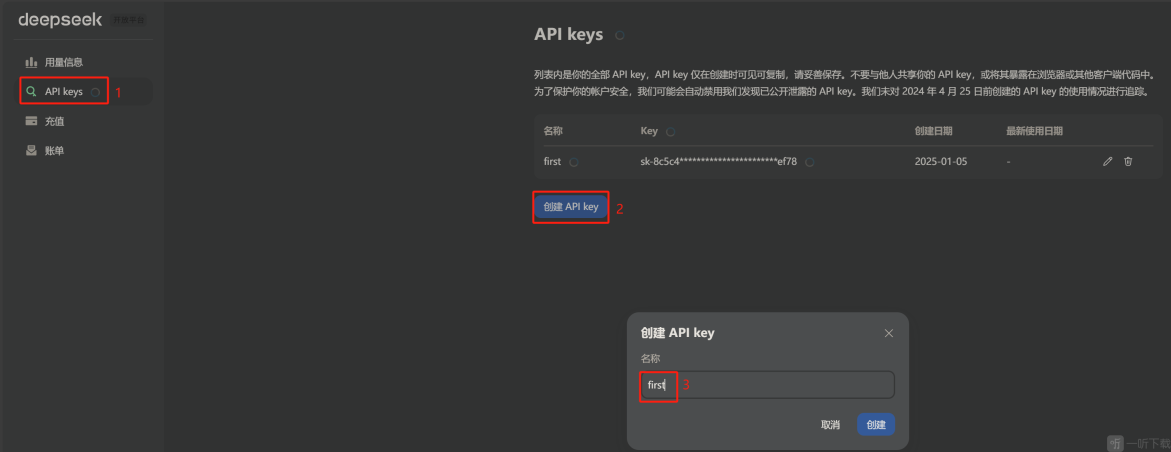 请注意:成功创建 key 后,请即刻进行复制并做好记录。一旦错过此时机,后续将无法再次查看,只能重新创建。