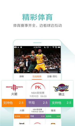 看体育赛事 : 除了cctv5在线直播,还有更多选择——cctv5+、四海钓鱼、劲爆体育、天元围棋、足球等各种体育直播频道齐全;NBA、中超、英超、亚冠、CBA、欧冠、西甲、意甲、德甲、法甲、奥运会、欧洲杯、美洲杯、世界杯预选赛、大师杯、各类世锦赛,你与赛场之间,只有一个播放器的距离。