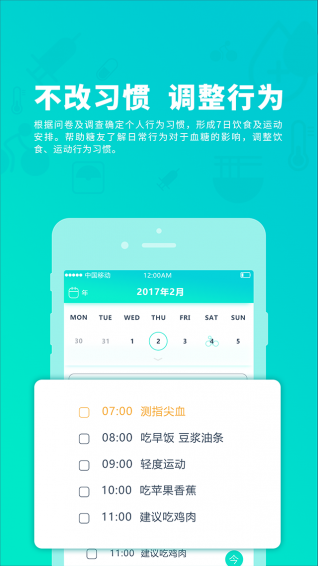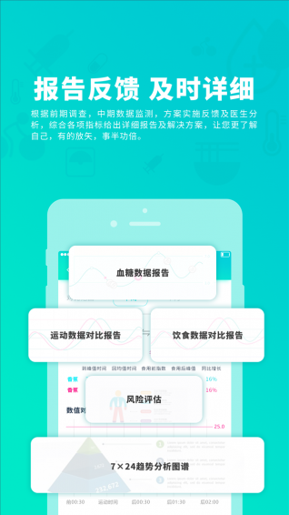 监测:采用实时动态血糖监测设备,通过蓝牙传输到APP中,帮助糖友随时看到自身糖尿病数据,为自我血糖管理提供数据帮助。代办:根据个人行为习惯填写问卷,形成7日饮食,运动事项。帮助糖友了解日常行为对于血糖的影响,调整饮食,运动行为习惯。
